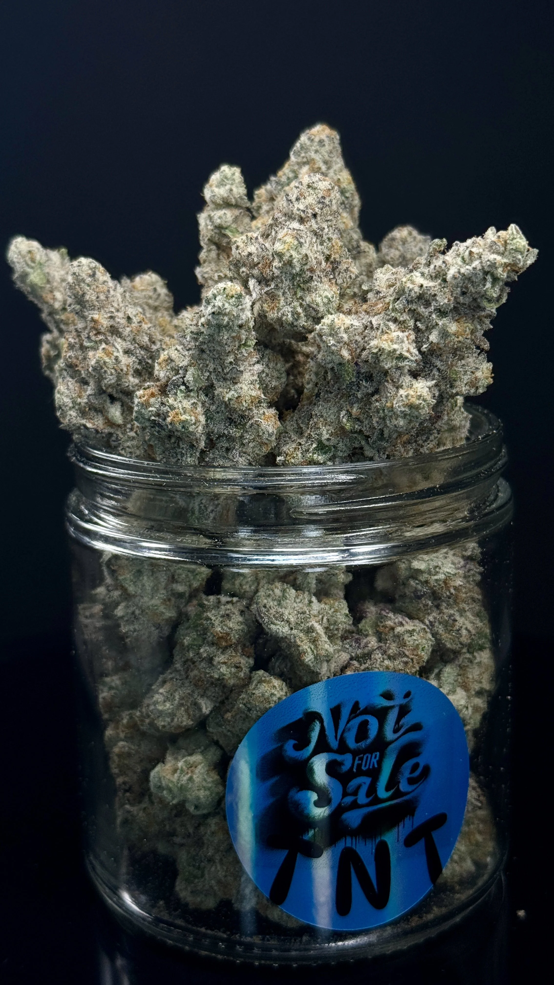 TNT ain’t just another jar on the shelf — it’s a stick of dynamite primed to blow the lid off your senses. Crack this jar and it’s like striking a match on a powder keg; the air floods with heavy gassy fuel, sharp funk, and a sweet-skunk finish that’ll pull you straight back to the glory days. Each dense nug is armor-plated in trichomes so thick they glisten like they’ve been rolled in diamond dust. The hit comes on hard, clean, and fast — straight to the dome — leaving you wide-eyed, grinning, and ready to run through walls. This ain’t no slow burn — it’s pure, high-grade detonation for the old heads who know what time it is.